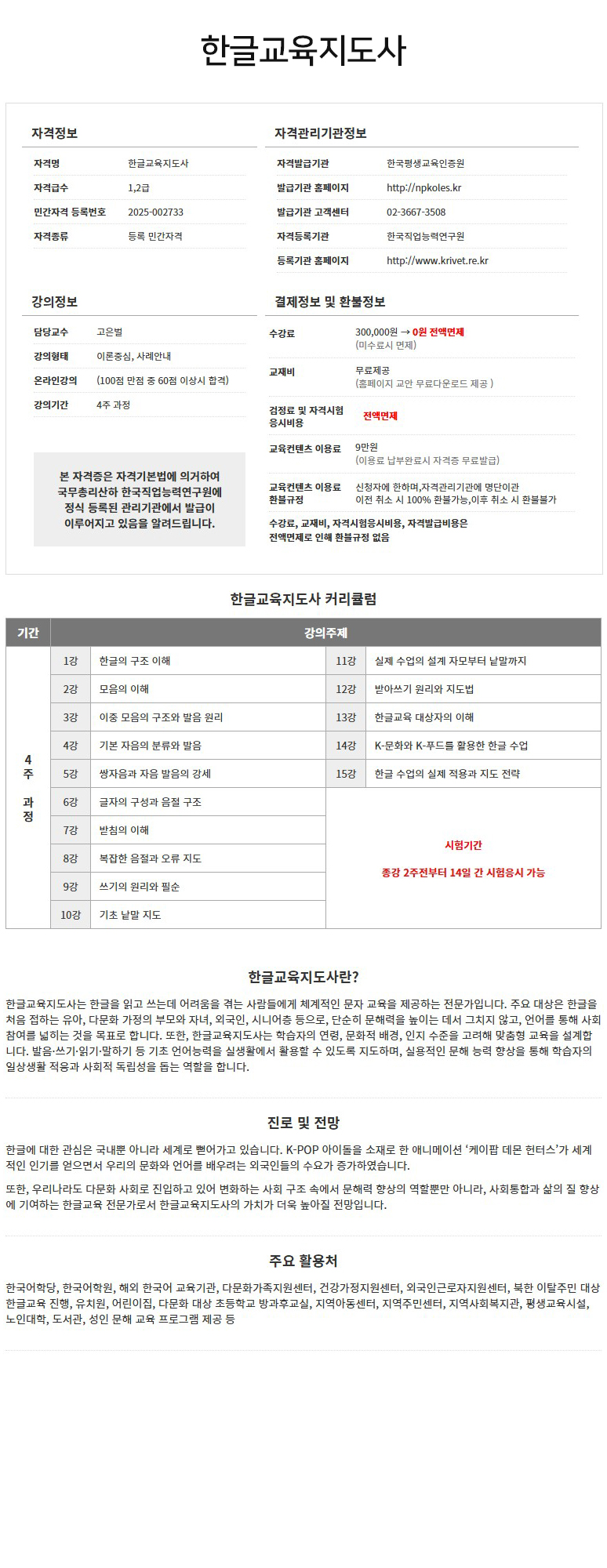 ¤ý¼ö°·á : ¤ý±³Àçºñ : ¹«·áÁ¦°ø(±³¾È ¹«·á´Ù¿î·Îµå Á¦°øÀ¸·Î ÀÎÇÑ È¯ºÒ±ÔÁ¤ ¾øÀ½) ¤ý°ËÁ¤·á ¹× ÀڰݽÃÇè ÀÀ½Ãºñ¿ë : Àü¾×¸éÁ¦(Àü¾×¸éÁ¦·Î ÀÎÇÑ È¯ºÒ±ÔÁ¤ ¾øÀ½) ¤ý±³À°ÄÁÅÙÃ÷ÀÌ¿ë·á : 9¸¸¿ø(ÀÌ¿ë·á ³³ºÎ¿Ï·á½Ã ÀÚ°ÝÁõ¹«·á¹ß±Þ) ¤ý±³À°ÄÁÅÙÃ÷ ÀÌ¿ë·á ȯºÒ±ÔÁ¤ : ½ÅûÀÚ¿¡ ÇÑÇϸç, Àڰݰü¸®±â°ü¿¡ ¸í´ÜÀ̰ü ÀÌÀü Ãë¼Ò ½Ã 100% ȯºÒ°¡´É, ÀÌÈÄ Ãë¼Ò ½Ã ȯºÒºÒ°¡ |